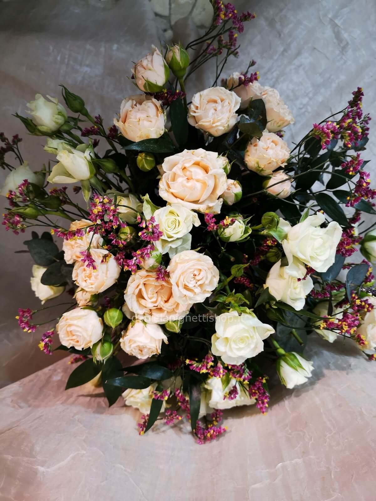 BOUQUET DI ROSELLINE AVORIO CON LIMONIUM
